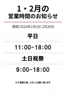 営業時間の変更について 営業時間の変更について 明日1月5日から2月28日まで営業時間が変更になります。 開店時間は普段と変わらず、 平日は11:00~、土日祝は9:00~ 閉店時間は終日18:00となります。 ご理解の程、よろしくお願い致します